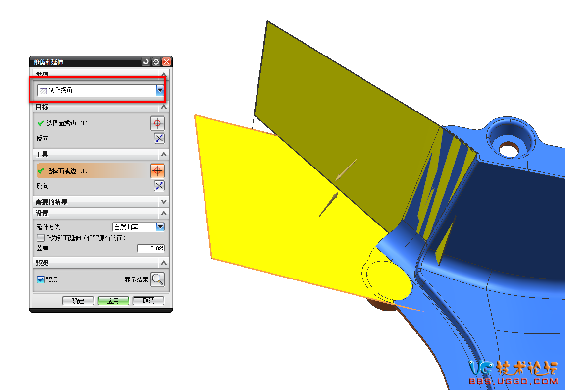 2.用“修剪和延(yán)伸”命(mìng)令將兩個麵創建拐角,注意類型選擇製(zhì)作拐角,結果如圖(tú)所示