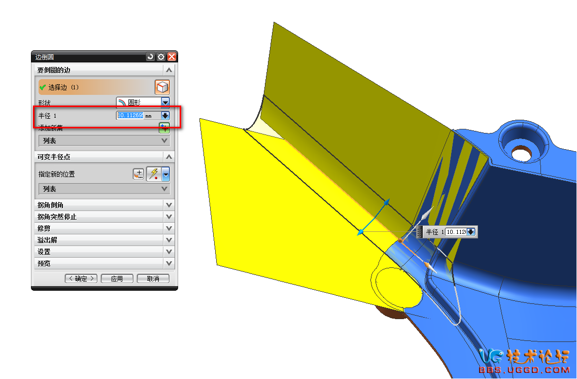 3.用“幾何(hé)屬性”命令測量兩(liǎng)個麵(miàn)之間的R角(jiǎo)是多少,並且將R角的數據(jù)複製下(xià)來,然後用“邊倒圓”命令將R角倒(dǎo)上,粘(zhān)貼R角的數據到半(bàn)徑1對話框(kuàng)中,確定